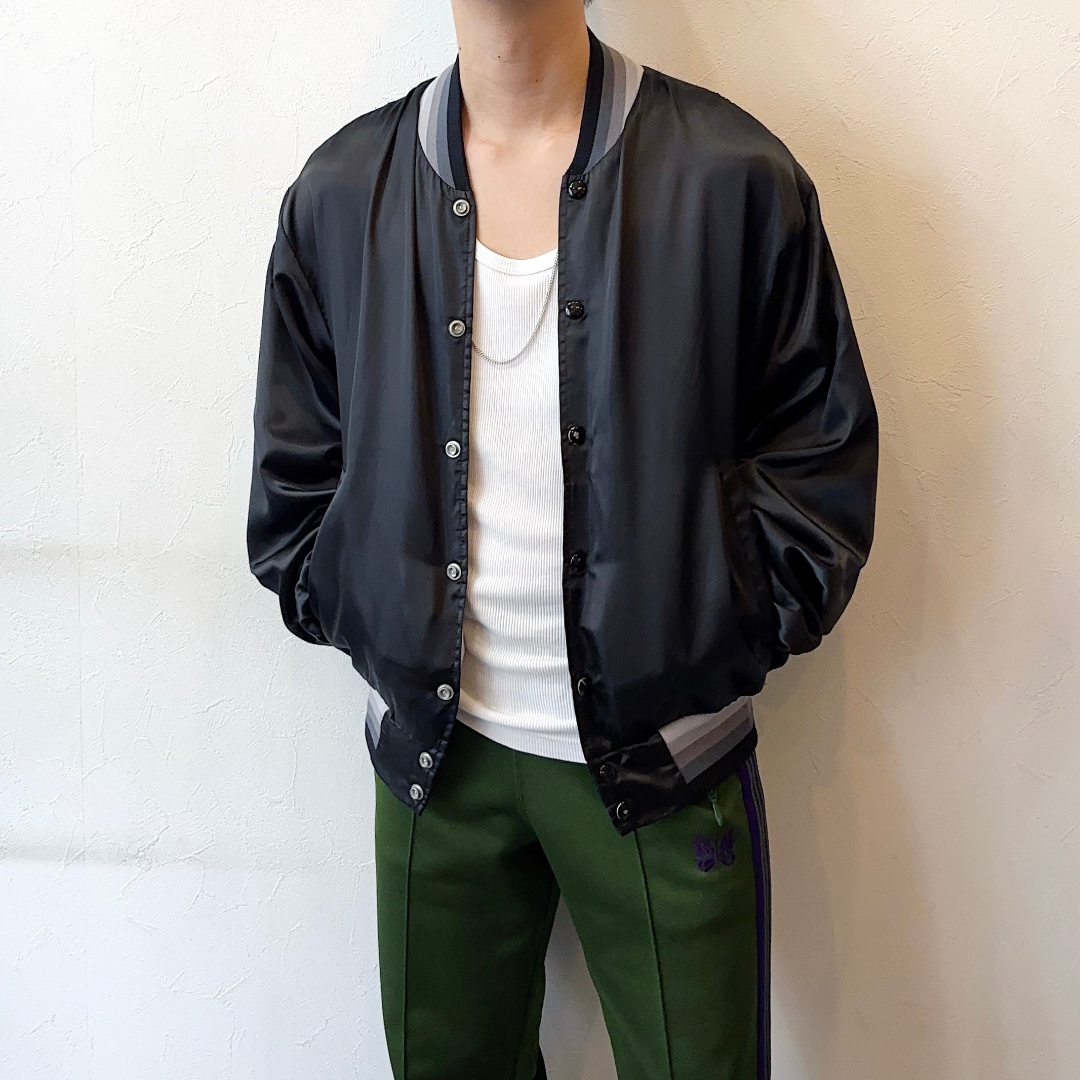 一際目を惹くセンスの良いバックの刺繍やカラーリングがクールなサテンジャケット。