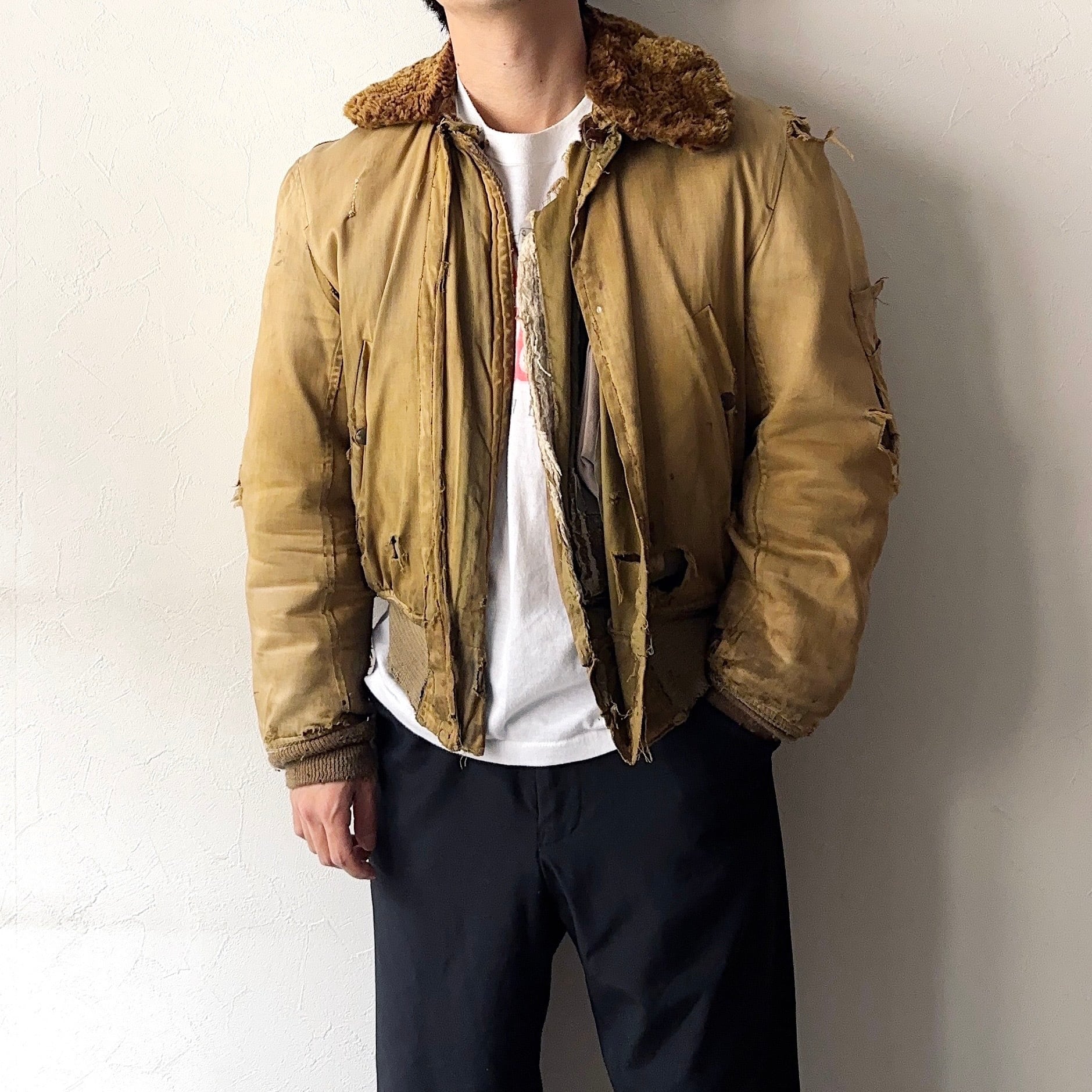 重厚感ある風合いやアートともとれる程のダメージが圧倒的な存在感を放つ50年代頃のB-15フライトジャケット。