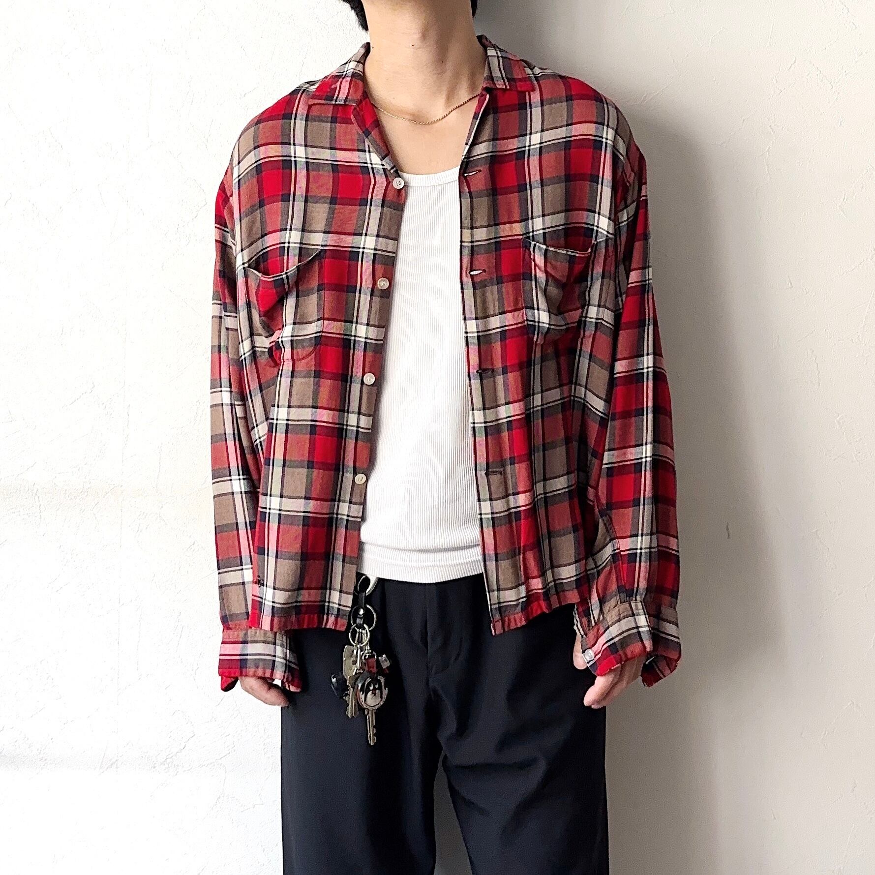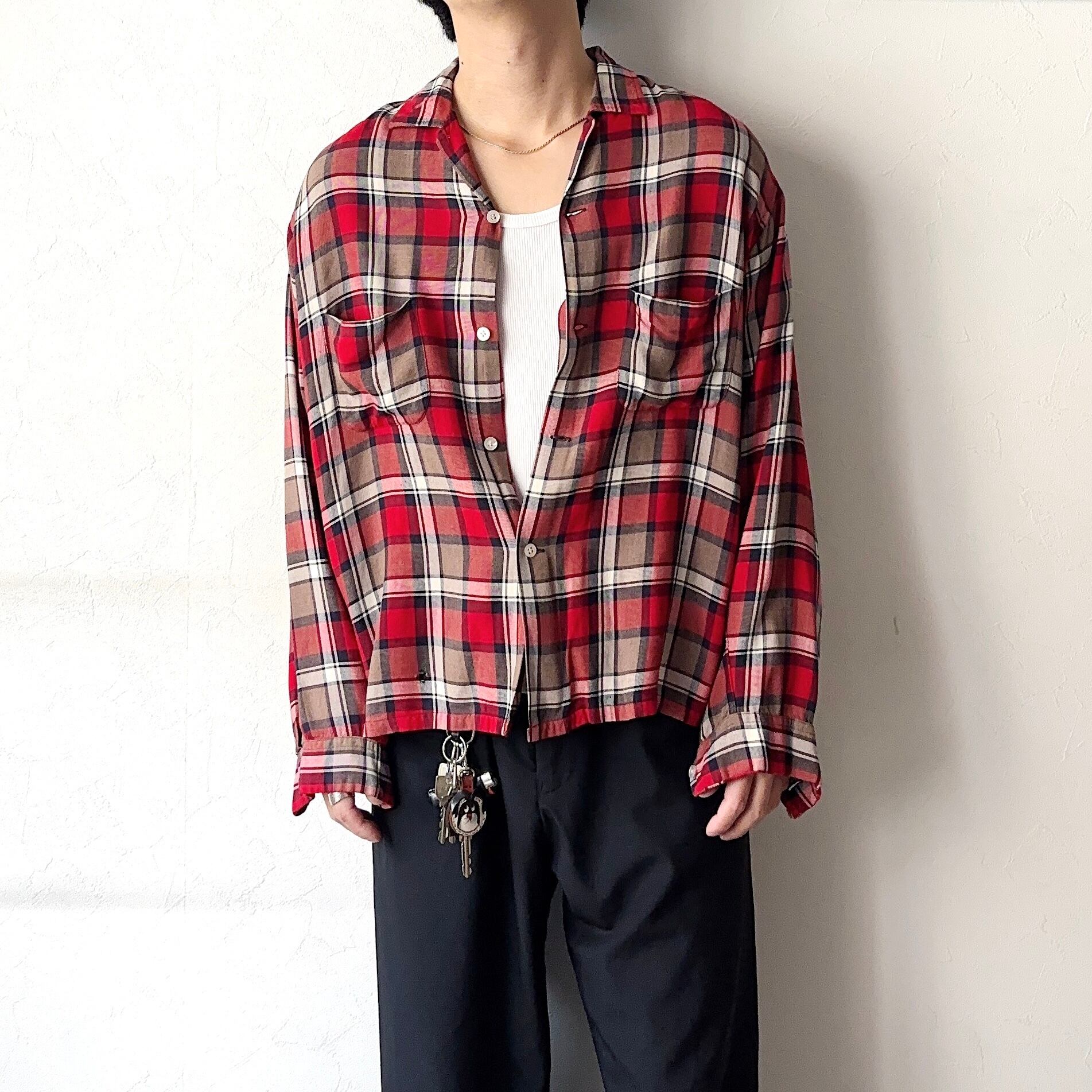 レーヨンならではの独特の光沢感やなめらかな素材感、とろみのある落ち感が魅力的な60年代のオープンカラーチェックシャツ。