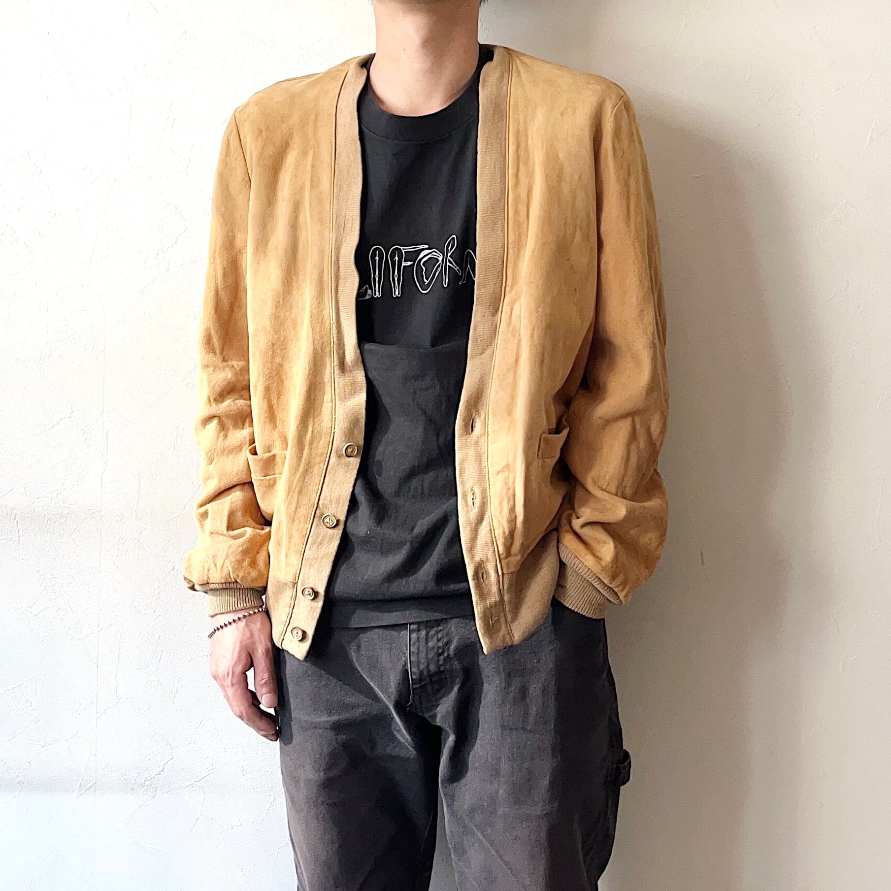 目を惹くデザインや美しいシルエットが非常にクールな70~80年代のスエードカーディガン。