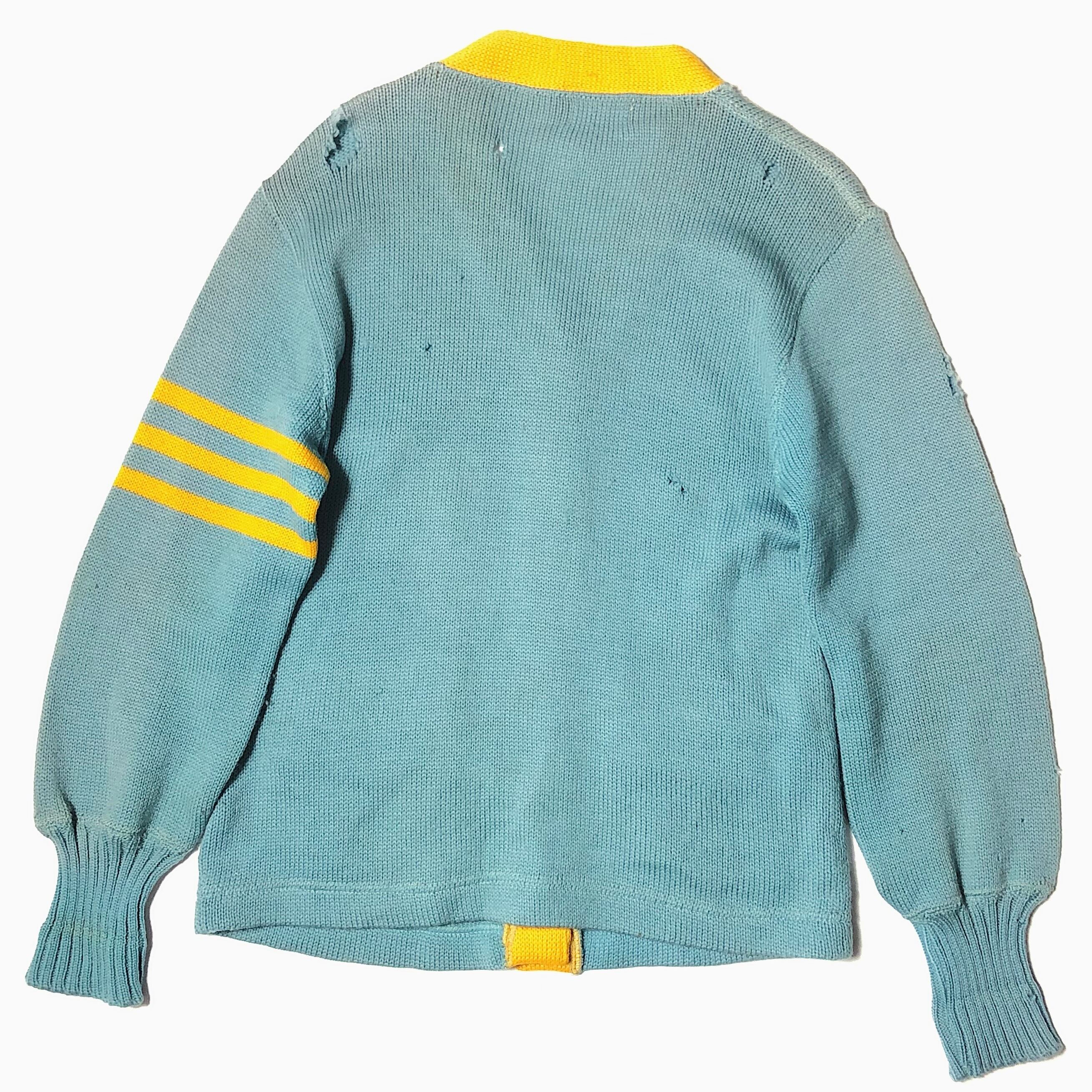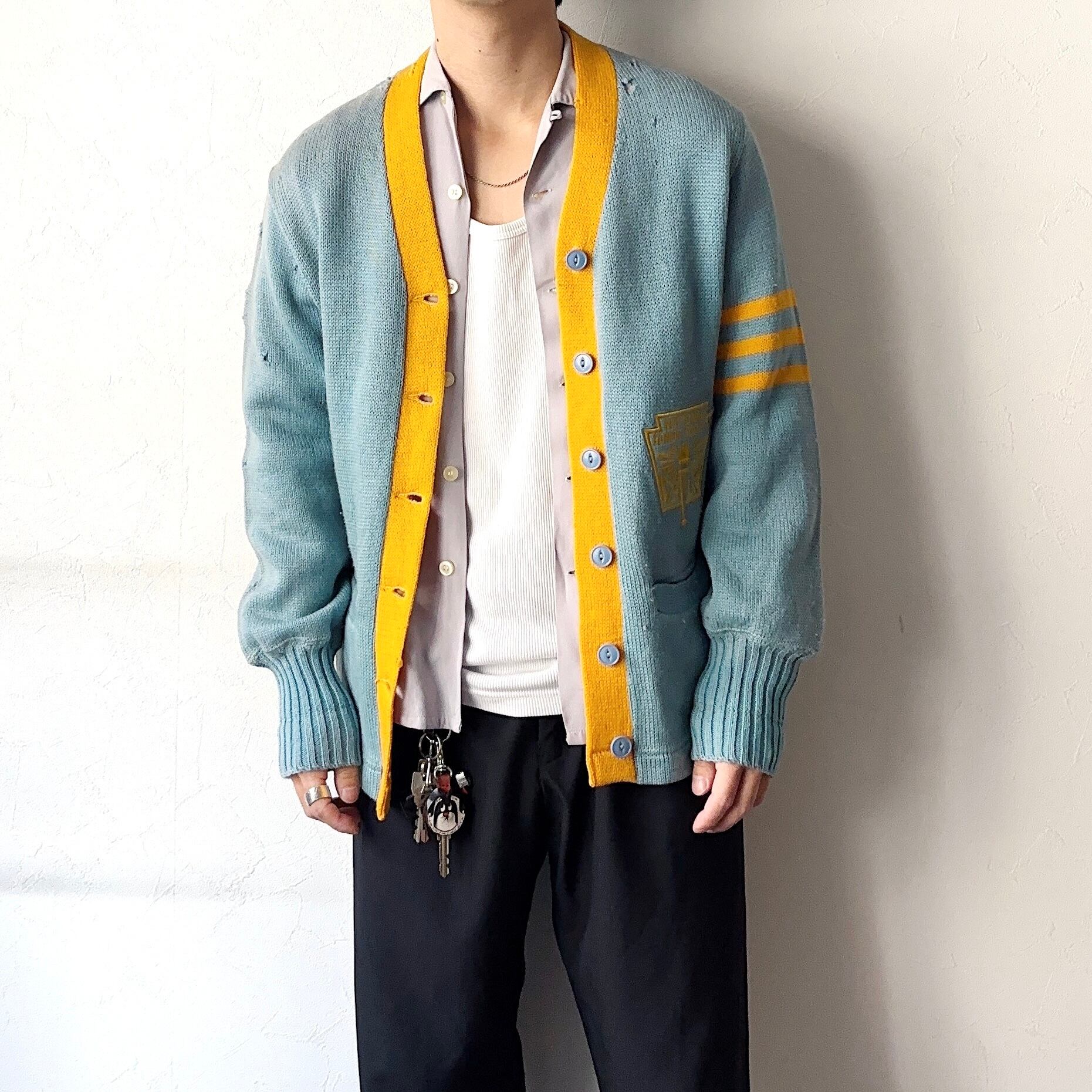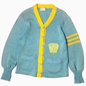 経年変化による風合いやダメージ、一際目を惹くキャッチーなカラーが非常にクールなレタードカーディガン。