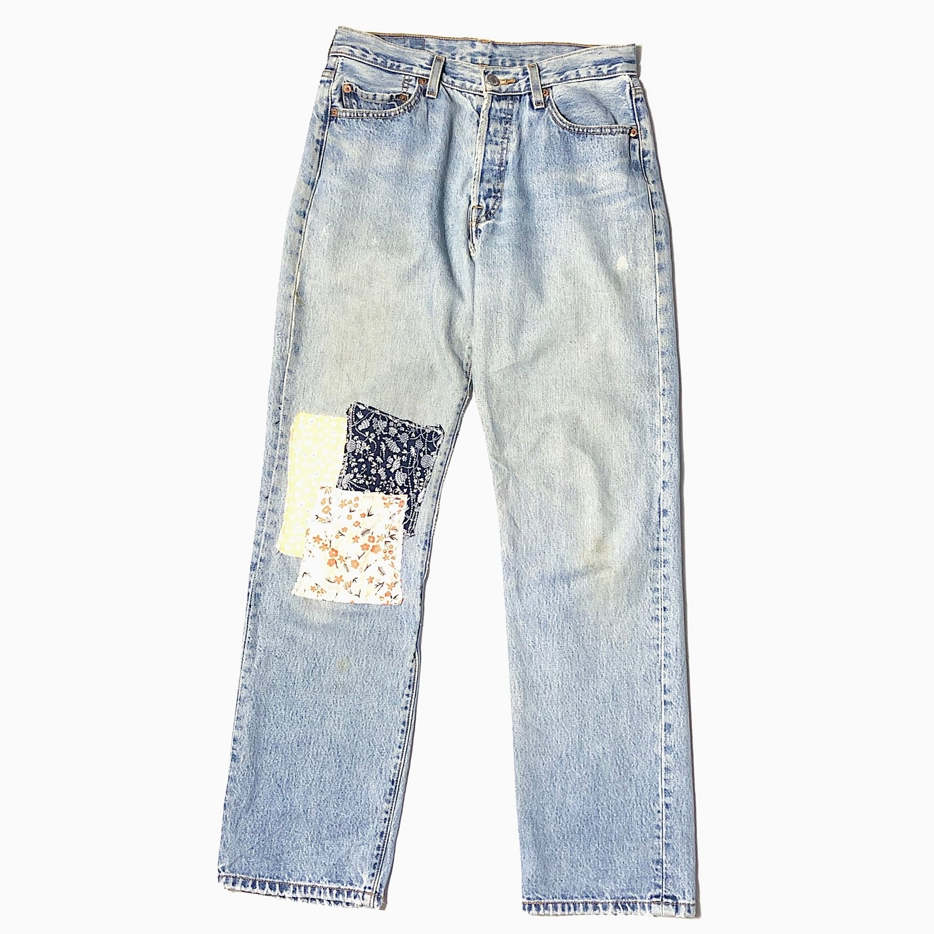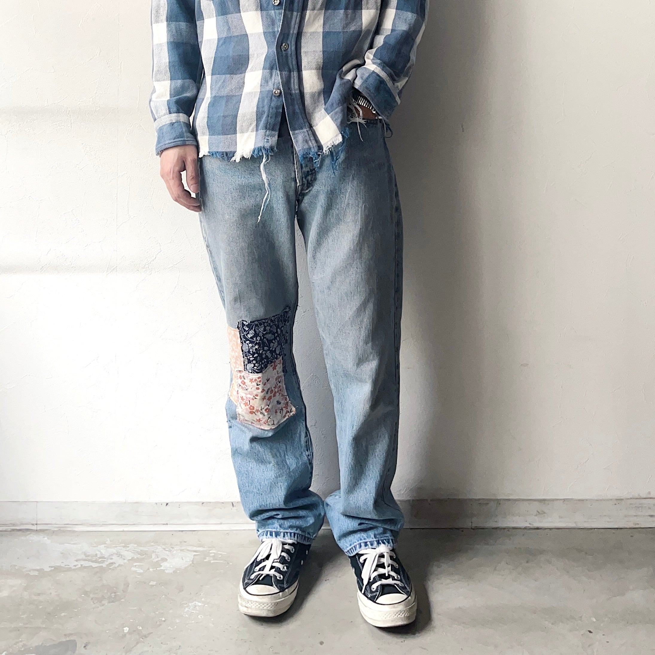 経年変化によるダメージや風合い、リペアが非常にクールなリーバイスの501デニムパンツ。
