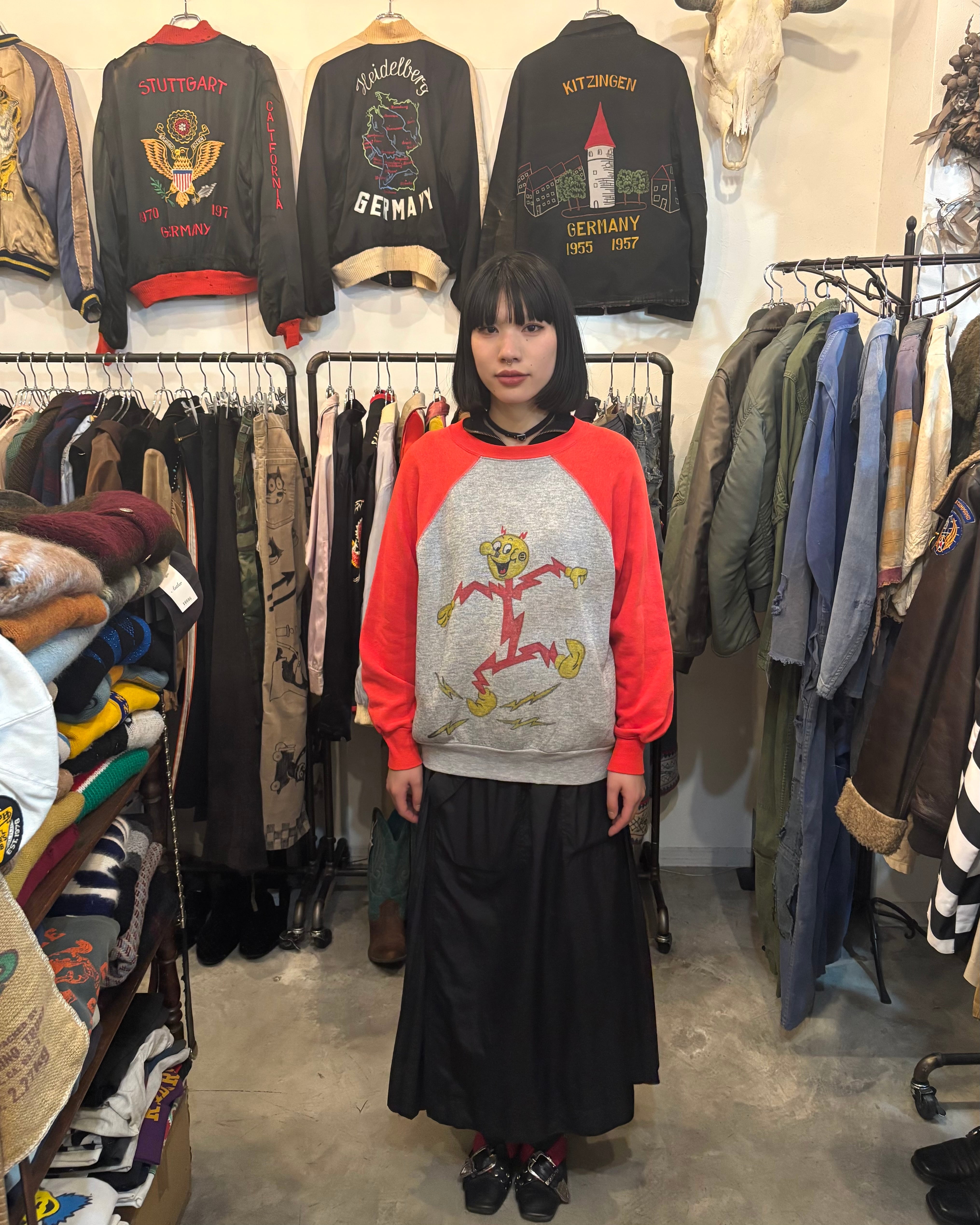 アメリカの人気キャラクター "レディ・キロワット" のキュートなペイントが施されたラグランスウェット。