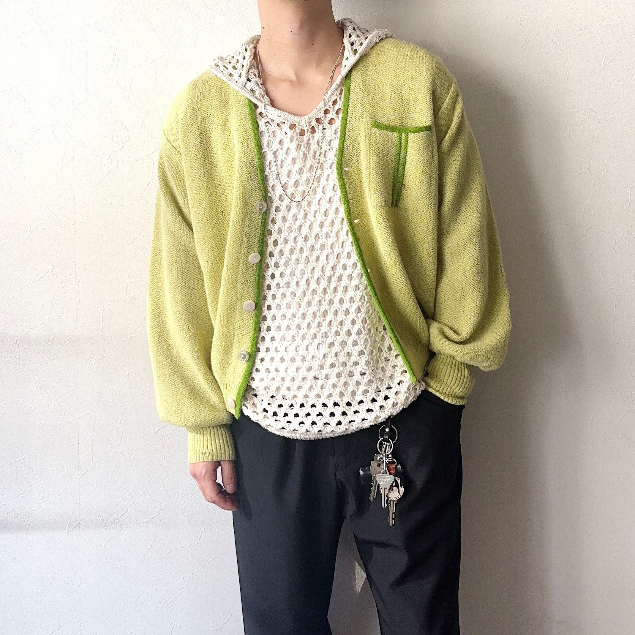 経年変化による風合いやダメージ、一際目を惹くキャッチーなカラーが非常にクールなアルパカカーディガン。