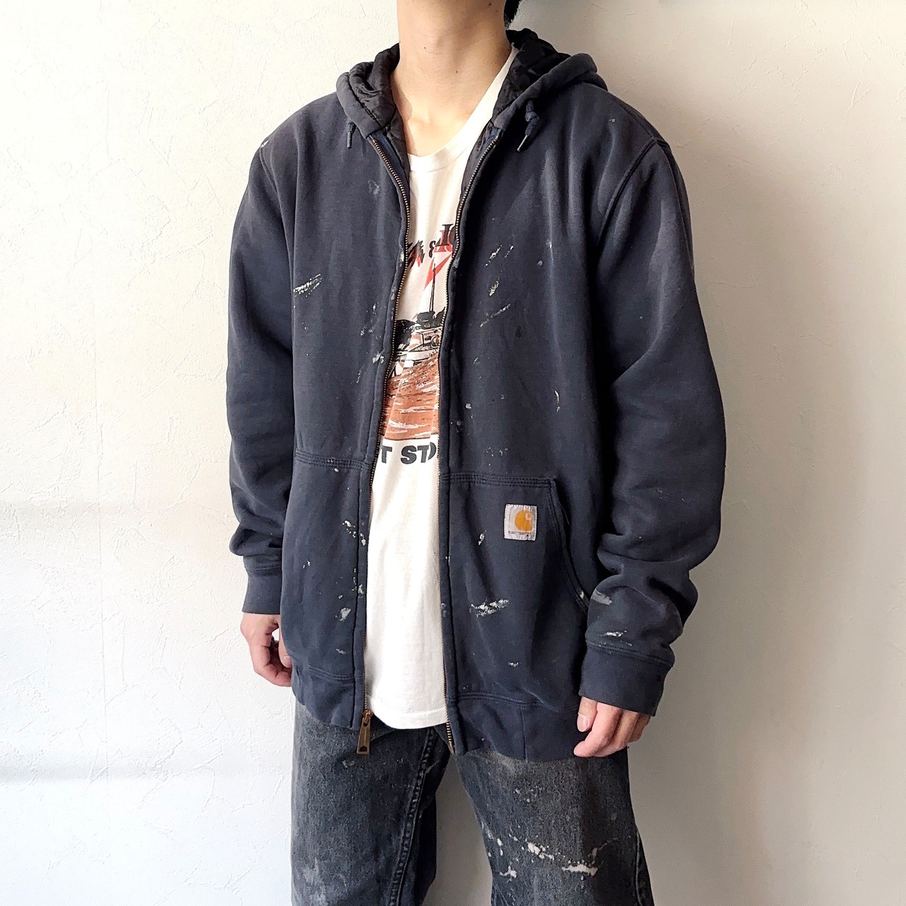 経年変化によるダメージや風合い、フェードがかったカラーやペンキ跡が非常にクールなジップアップパーカー。