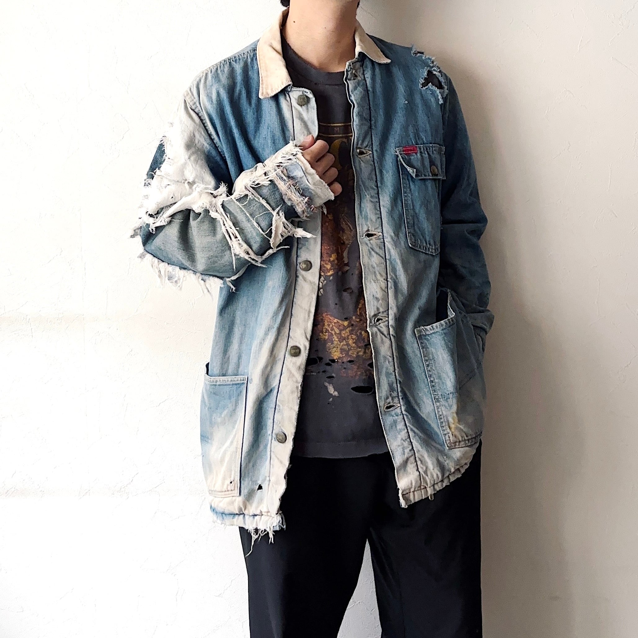アートともとれる程の風合いやダメージ、リペアが圧倒的な存在感を放つ70年代頃のカバーオール。