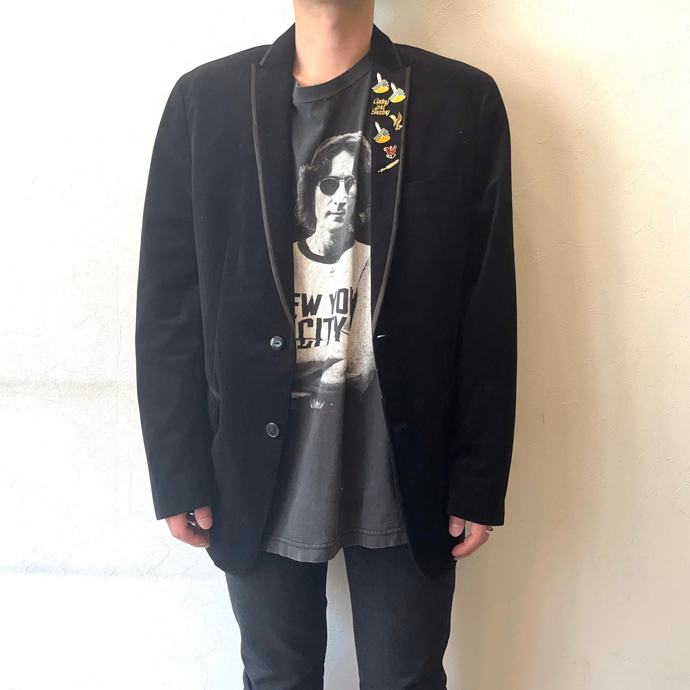 ラペルのピンがクールに映る、まさに唯一無二の一着。