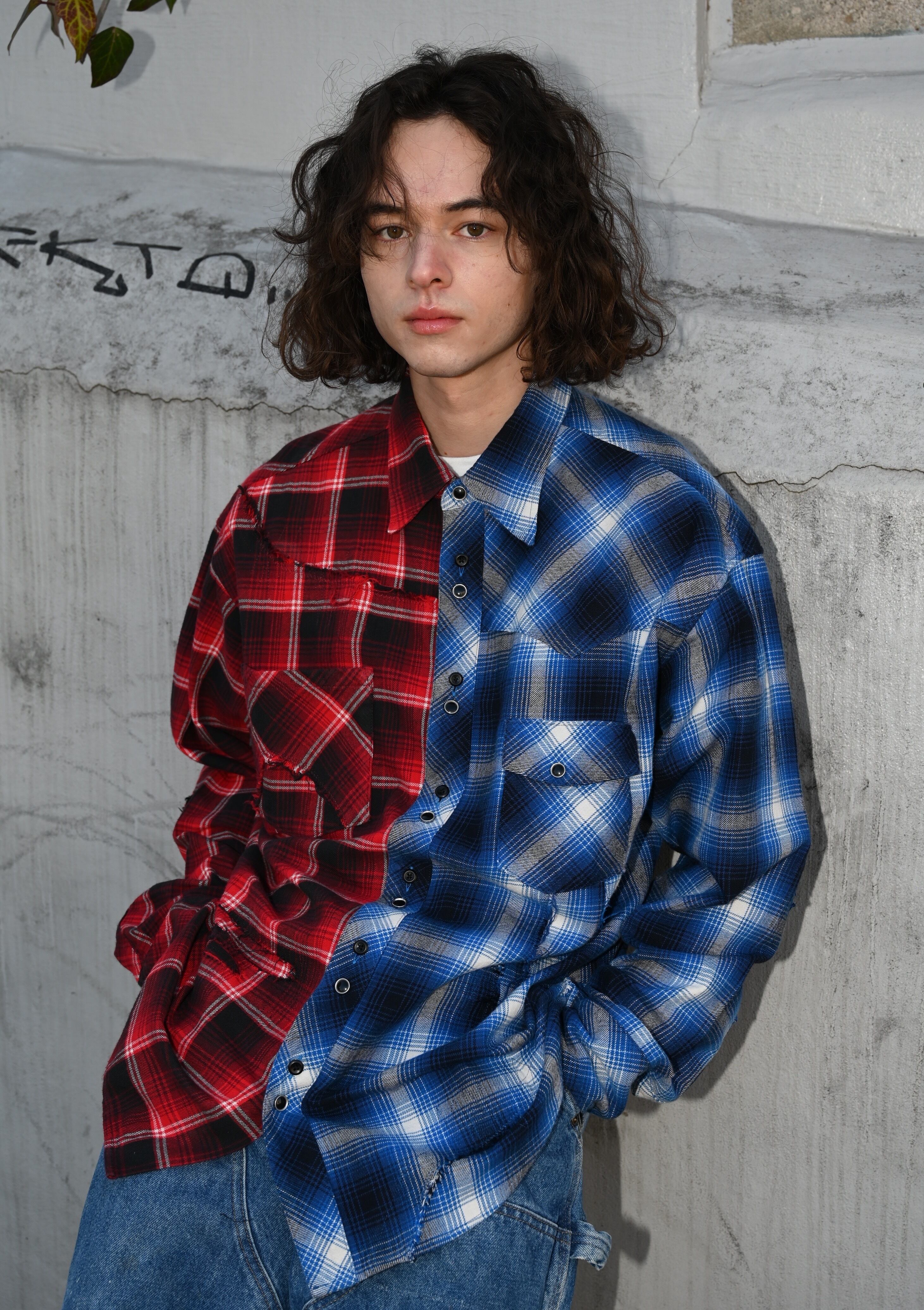 オリジナルのオンブレチェックや継接ぎのリメイクなどデザイン性の高い一着となっている。