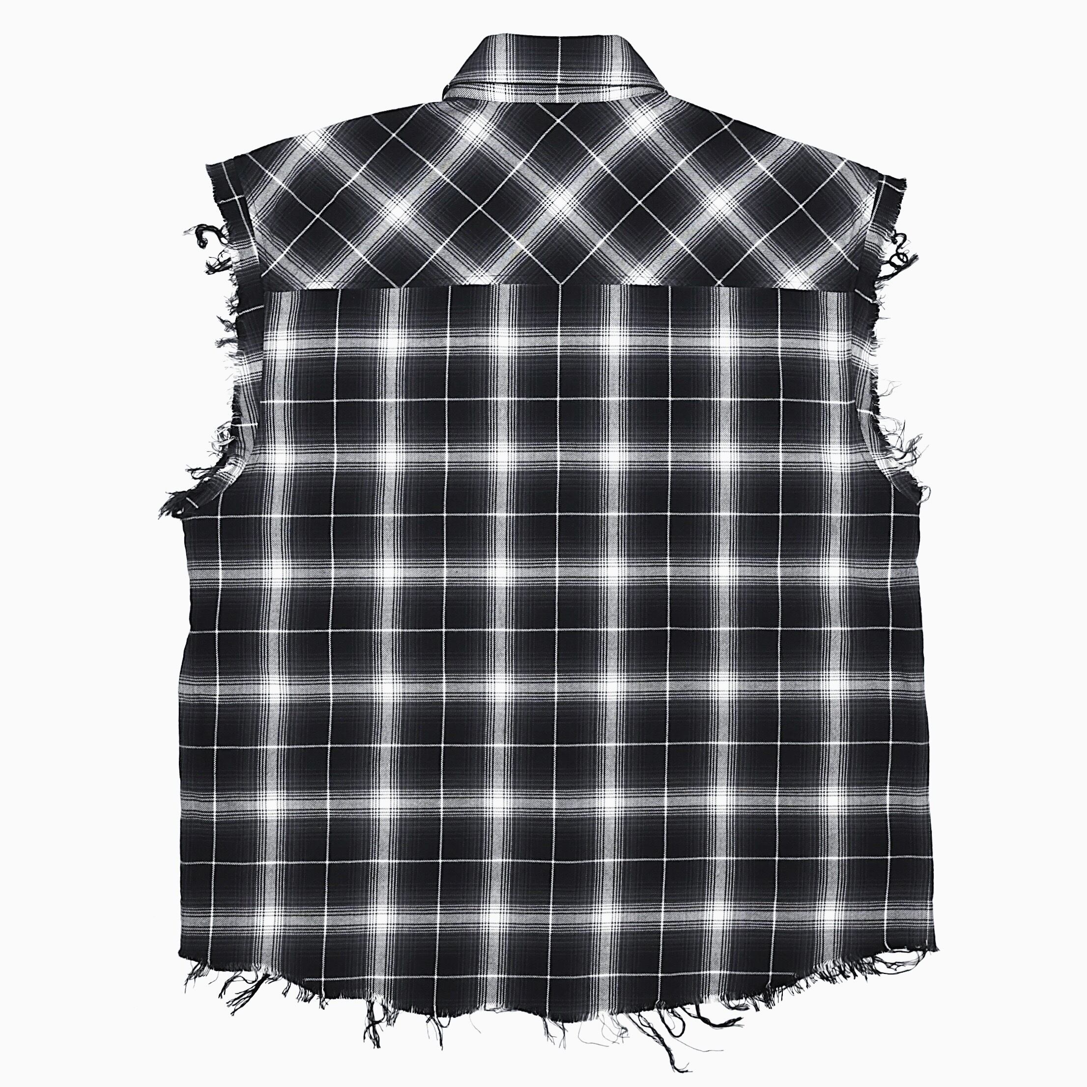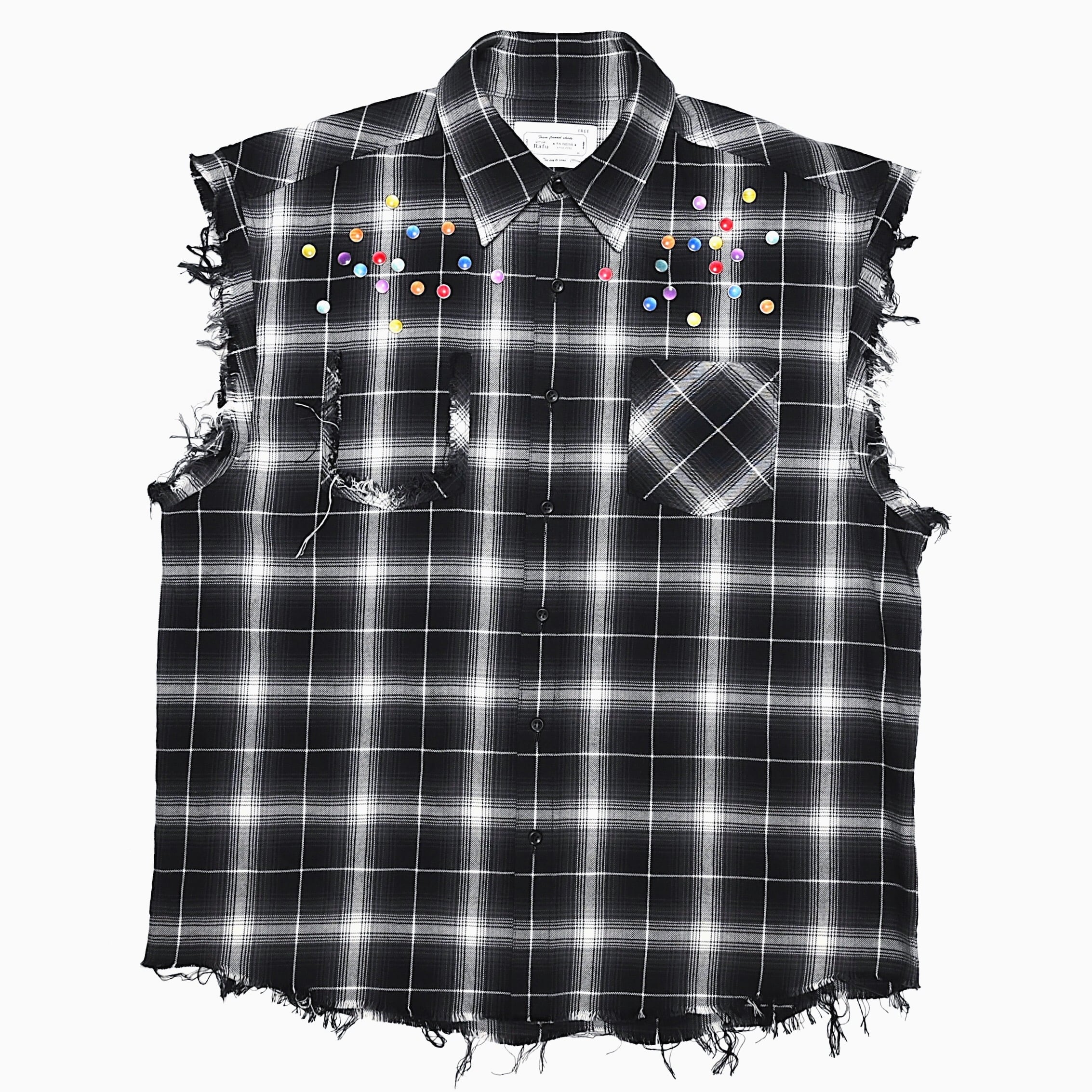 センスの良いオリジナルのチェック柄やフロントに施されたカラフルなスタッズやカットオフされた袖などデザイン性の高い一着となっている。