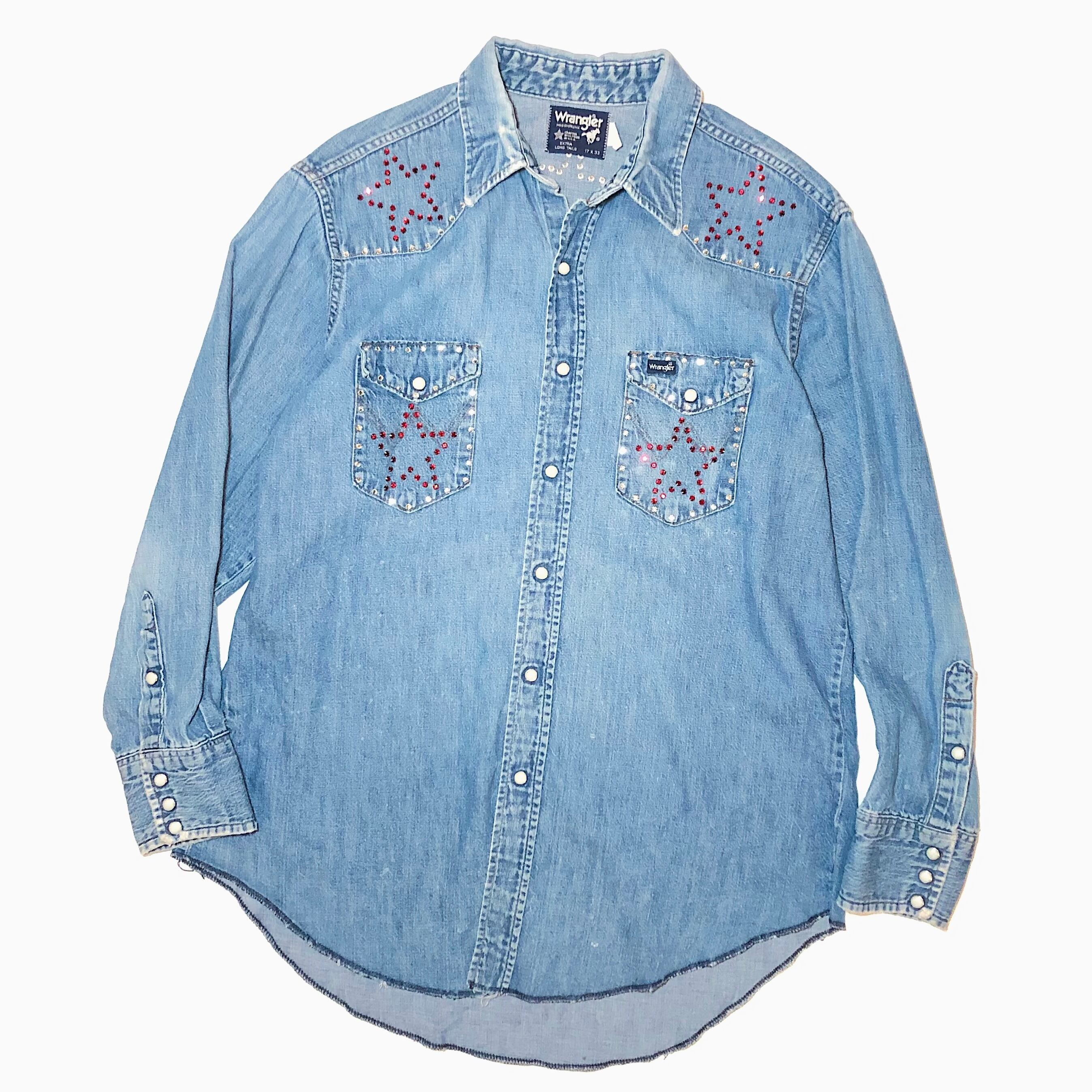 経年変化によるダメージや、一際目を惹くビーズの装飾が非常にクールなラングラーのデニムシャツ。