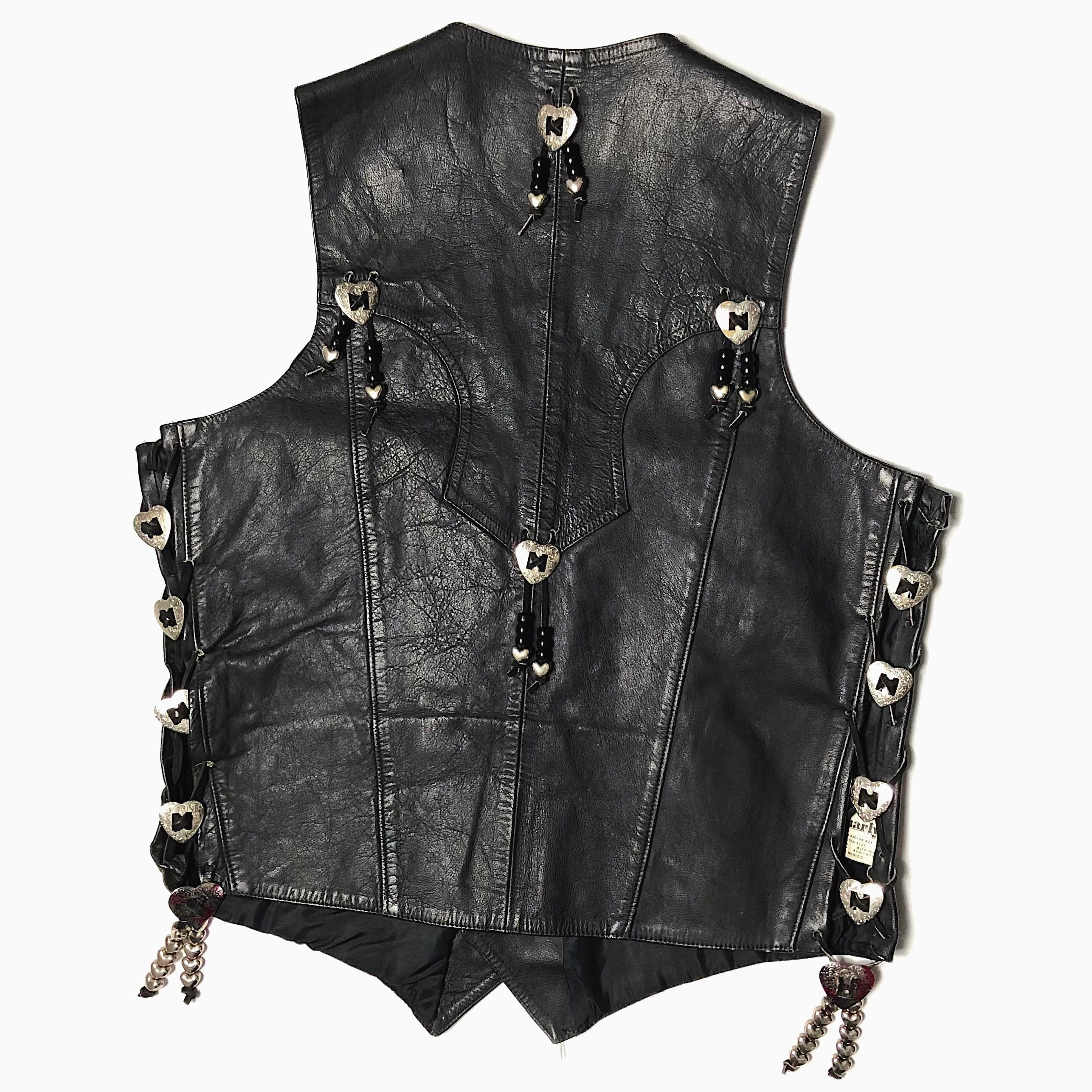 ハート型のコンチョやバッジ、サイドのレースなど特徴的なデザインが非常にクールなレザーべスト。